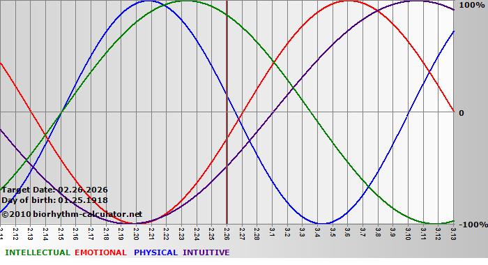 Your biorhythm above the horizontal line indicates that your capacity in that area is enhanced; you feel stronger, more alert, more connected, more empathetic. These are times when you are able to do more, be more, enjoy more. When the biorhythm lines are below 0%, your capacity is diminished, and conservative behavior is recommended.