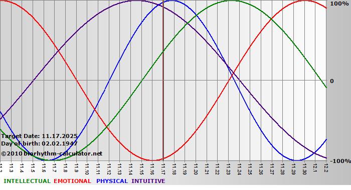 Your biorhythm above the horizontal line indicates that your capacity in that area is enhanced; you feel stronger, more alert, more connected, more empathetic. These are times when you are able to do more, be more, enjoy more. When the biorhythm lines are below 0%, your capacity is diminished, and conservative behavior is recommended.