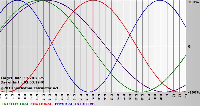 Your biorhythm above the horizontal line indicates that your capacity in that area is enhanced; you feel stronger, more alert, more connected, more empathetic. These are times when you are able to do more, be more, enjoy more. When the biorhythm lines are below 0%, your capacity is diminished, and conservative behavior is recommended.