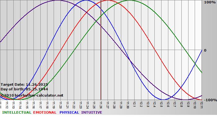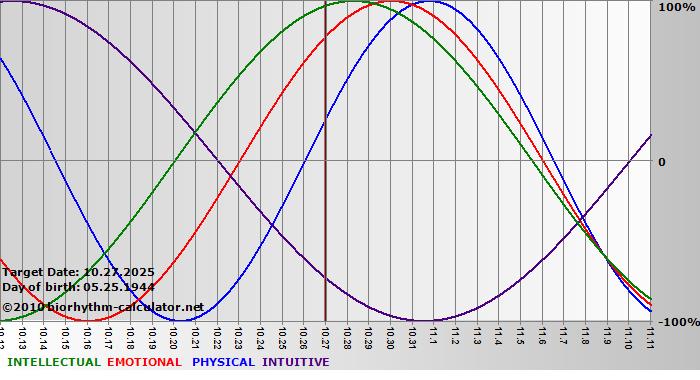 Your biorhythm above the horizontal line indicates that your capacity in that area is enhanced; you feel stronger, more alert, more connected, more empathetic. These are times when you are able to do more, be more, enjoy more. When the biorhythm lines are below 0%, your capacity is diminished, and conservative behavior is recommended.