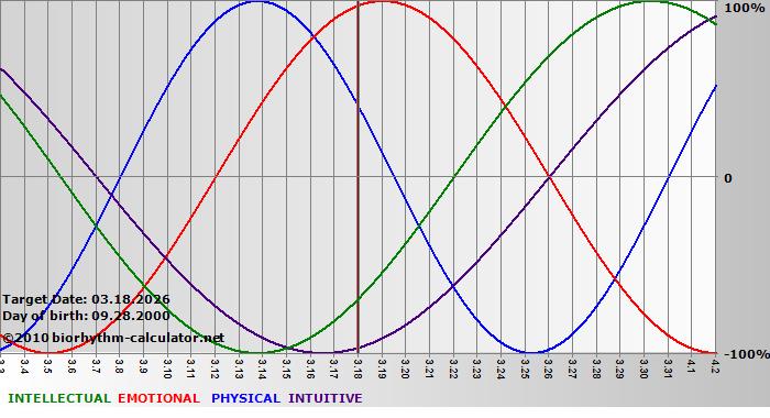 Your biorhythm above the horizontal line indicates that your capacity in that area is enhanced; you feel stronger, more alert, more connected, more empathetic. These are times when you are able to do more, be more, enjoy more. When the biorhythm lines are below 0%, your capacity is diminished, and conservative behavior is recommended.
