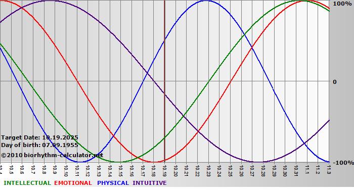 Your biorhythm above the horizontal line indicates that your capacity in that area is enhanced; you feel stronger, more alert, more connected, more empathetic. These are times when you are able to do more, be more, enjoy more. When the biorhythm lines are below 0%, your capacity is diminished, and conservative behavior is recommended.