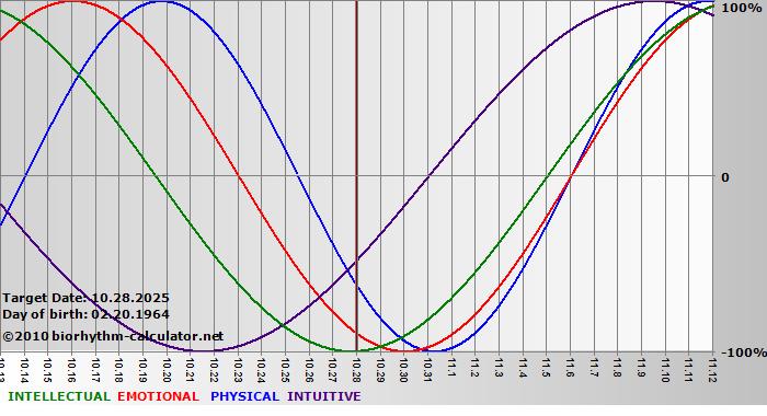 Your biorhythm above the horizontal line indicates that your capacity in that area is enhanced; you feel stronger, more alert, more connected, more empathetic. These are times when you are able to do more, be more, enjoy more. When the biorhythm lines are below 0%, your capacity is diminished, and conservative behavior is recommended.
