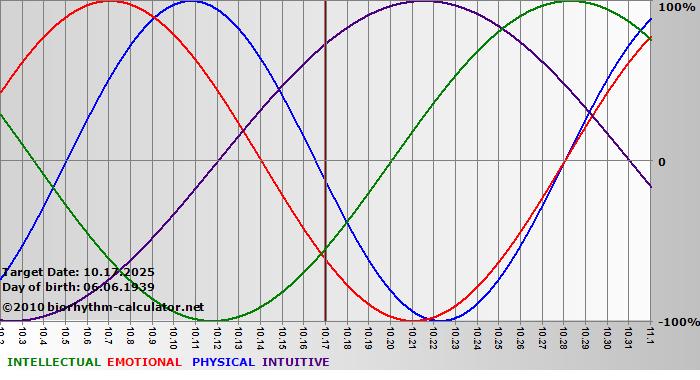Your biorhythm above the horizontal line indicates that your capacity in that area is enhanced; you feel stronger, more alert, more connected, more empathetic. These are times when you are able to do more, be more, enjoy more. When the biorhythm lines are below 0%, your capacity is diminished, and conservative behavior is recommended.