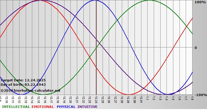 Your biorhythm above the horizontal line indicates that your capacity in that area is enhanced; you feel stronger, more alert, more connected, more empathetic. These are times when you are able to do more, be more, enjoy more. When the biorhythm lines are below 0%, your capacity is diminished, and conservative behavior is recommended.