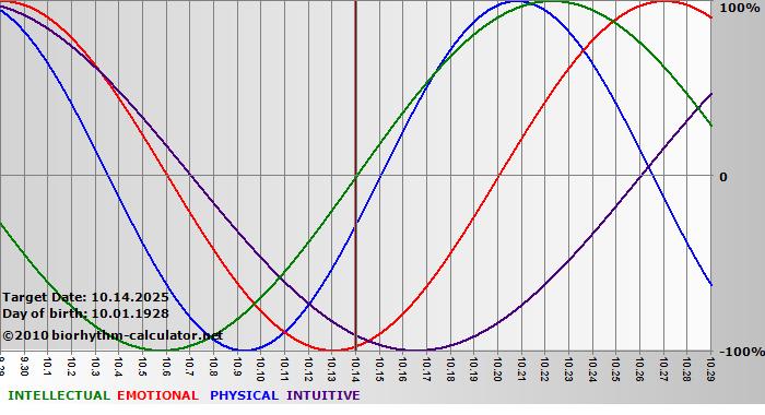 Your biorhythm above the horizontal line indicates that your capacity in that area is enhanced; you feel stronger, more alert, more connected, more empathetic. These are times when you are able to do more, be more, enjoy more. When the biorhythm lines are below 0%, your capacity is diminished, and conservative behavior is recommended.