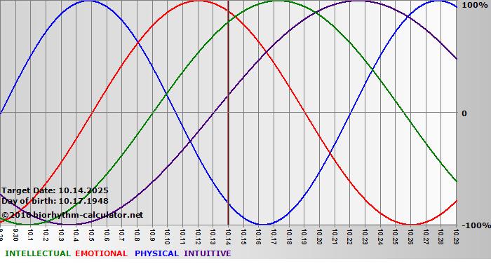 Your biorhythm above the horizontal line indicates that your capacity in that area is enhanced; you feel stronger, more alert, more connected, more empathetic. These are times when you are able to do more, be more, enjoy more. When the biorhythm lines are below 0%, your capacity is diminished, and conservative behavior is recommended.