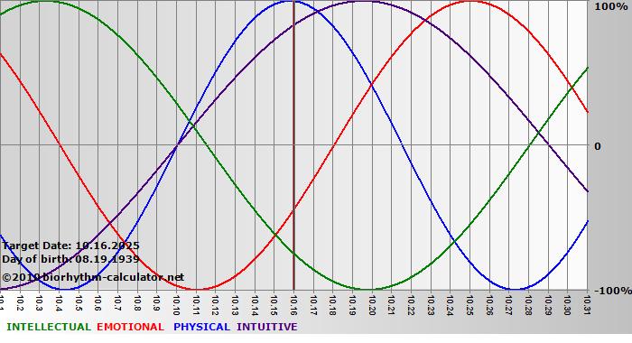 Your biorhythm above the horizontal line indicates that your capacity in that area is enhanced; you feel stronger, more alert, more connected, more empathetic. These are times when you are able to do more, be more, enjoy more. When the biorhythm lines are below 0%, your capacity is diminished, and conservative behavior is recommended.