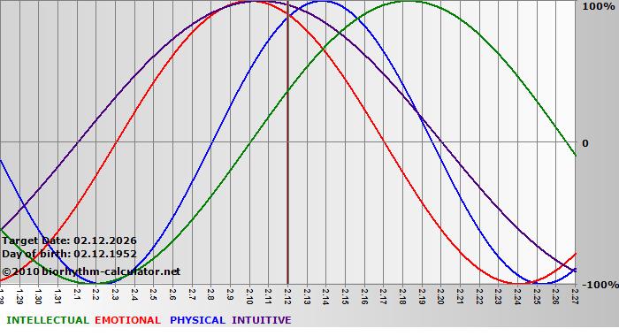 Your biorhythm above the horizontal line indicates that your capacity in that area is enhanced; you feel stronger, more alert, more connected, more empathetic. These are times when you are able to do more, be more, enjoy more. When the biorhythm lines are below 0%, your capacity is diminished, and conservative behavior is recommended.