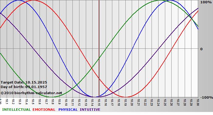 Your biorhythm above the horizontal line indicates that your capacity in that area is enhanced; you feel stronger, more alert, more connected, more empathetic. These are times when you are able to do more, be more, enjoy more. When the biorhythm lines are below 0%, your capacity is diminished, and conservative behavior is recommended.