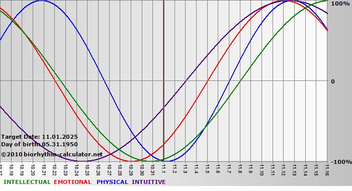 Your biorhythm above the horizontal line indicates that your capacity in that area is enhanced; you feel stronger, more alert, more connected, more empathetic. These are times when you are able to do more, be more, enjoy more. When the biorhythm lines are below 0%, your capacity is diminished, and conservative behavior is recommended.