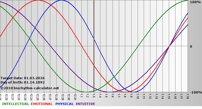 Your biorhythm above the horizontal line indicates that your capacity in that area is enhanced; you feel stronger, more alert, more connected, more empathetic. These are times when you are able to do more, be more, enjoy more. When the biorhythm lines are below 0%, your capacity is diminished, and conservative behavior is recommended.