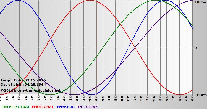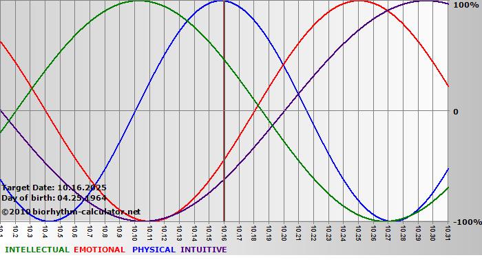 Your biorhythm above the horizontal line indicates that your capacity in that area is enhanced; you feel stronger, more alert, more connected, more empathetic. These are times when you are able to do more, be more, enjoy more. When the biorhythm lines are below 0%, your capacity is diminished, and conservative behavior is recommended.