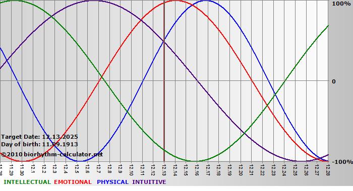 Your biorhythm above the horizontal line indicates that your capacity in that area is enhanced; you feel stronger, more alert, more connected, more empathetic. These are times when you are able to do more, be more, enjoy more. When the biorhythm lines are below 0%, your capacity is diminished, and conservative behavior is recommended.
