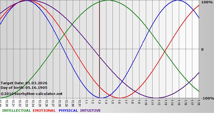 Your biorhythm above the horizontal line indicates that your capacity in that area is enhanced; you feel stronger, more alert, more connected, more empathetic. These are times when you are able to do more, be more, enjoy more. When the biorhythm lines are below 0%, your capacity is diminished, and conservative behavior is recommended.