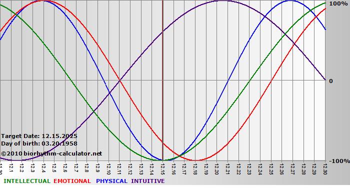 Your biorhythm above the horizontal line indicates that your capacity in that area is enhanced; you feel stronger, more alert, more connected, more empathetic. These are times when you are able to do more, be more, enjoy more. When the biorhythm lines are below 0%, your capacity is diminished, and conservative behavior is recommended.