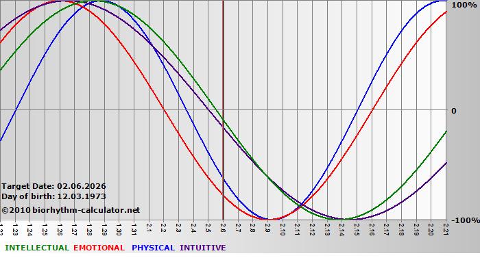 Your biorhythm above the horizontal line indicates that your capacity in that area is enhanced; you feel stronger, more alert, more connected, more empathetic. These are times when you are able to do more, be more, enjoy more. When the biorhythm lines are below 0%, your capacity is diminished, and conservative behavior is recommended.