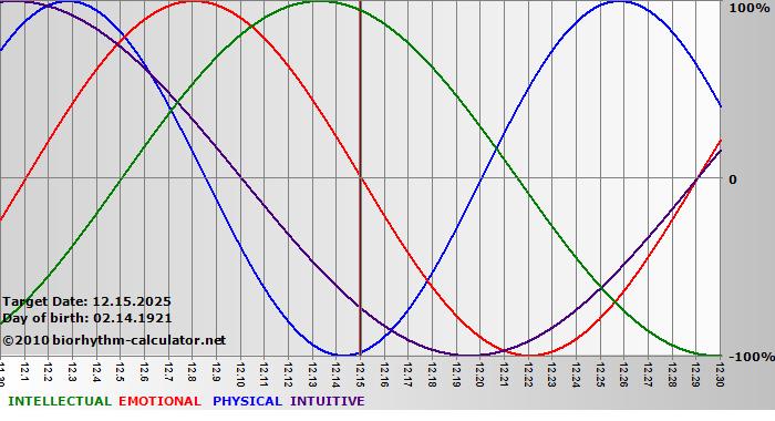 Your biorhythm above the horizontal line indicates that your capacity in that area is enhanced; you feel stronger, more alert, more connected, more empathetic. These are times when you are able to do more, be more, enjoy more. When the biorhythm lines are below 0%, your capacity is diminished, and conservative behavior is recommended.