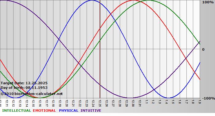 Your biorhythm above the horizontal line indicates that your capacity in that area is enhanced; you feel stronger, more alert, more connected, more empathetic. These are times when you are able to do more, be more, enjoy more. When the biorhythm lines are below 0%, your capacity is diminished, and conservative behavior is recommended.