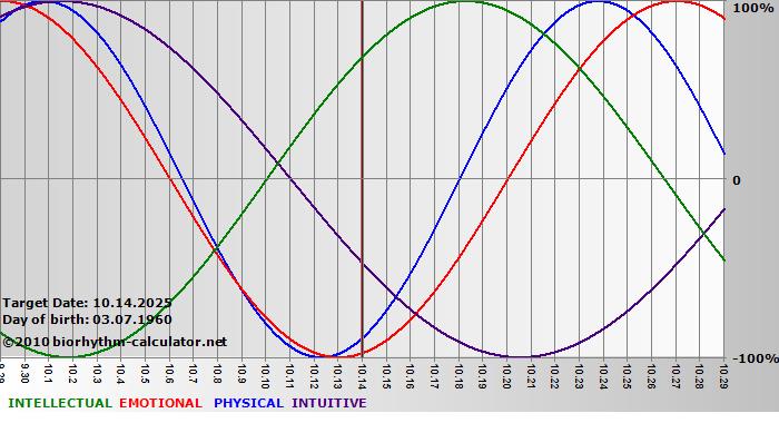 Your biorhythm above the horizontal line indicates that your capacity in that area is enhanced; you feel stronger, more alert, more connected, more empathetic. These are times when you are able to do more, be more, enjoy more. When the biorhythm lines are below 0%, your capacity is diminished, and conservative behavior is recommended.