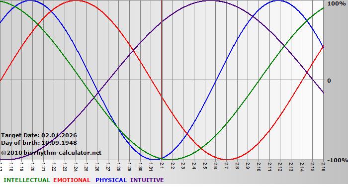 Your biorhythm above the horizontal line indicates that your capacity in that area is enhanced; you feel stronger, more alert, more connected, more empathetic. These are times when you are able to do more, be more, enjoy more. When the biorhythm lines are below 0%, your capacity is diminished, and conservative behavior is recommended.