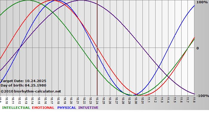 Your biorhythm above the horizontal line indicates that your capacity in that area is enhanced; you feel stronger, more alert, more connected, more empathetic. These are times when you are able to do more, be more, enjoy more. When the biorhythm lines are below 0%, your capacity is diminished, and conservative behavior is recommended.