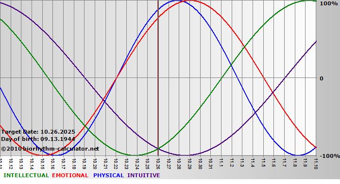 Your biorhythm above the horizontal line indicates that your capacity in that area is enhanced; you feel stronger, more alert, more connected, more empathetic. These are times when you are able to do more, be more, enjoy more. When the biorhythm lines are below 0%, your capacity is diminished, and conservative behavior is recommended.