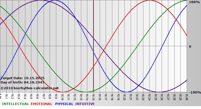 Your biorhythm above the horizontal line indicates that your capacity in that area is enhanced; you feel stronger, more alert, more connected, more empathetic. These are times when you are able to do more, be more, enjoy more. When the biorhythm lines are below 0%, your capacity is diminished, and conservative behavior is recommended.