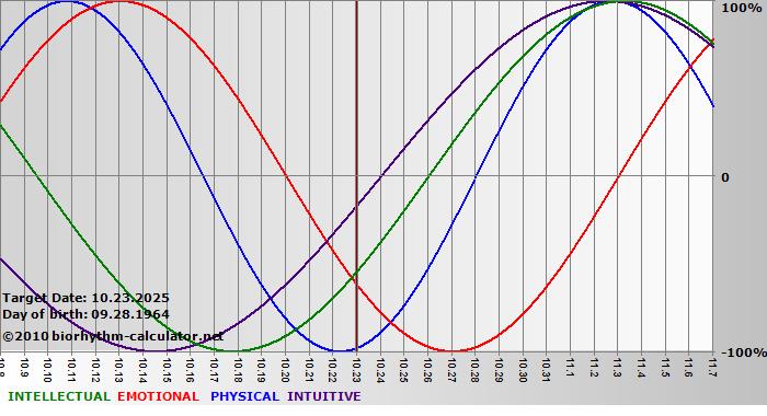 Your biorhythm above the horizontal line indicates that your capacity in that area is enhanced; you feel stronger, more alert, more connected, more empathetic. These are times when you are able to do more, be more, enjoy more. When the biorhythm lines are below 0%, your capacity is diminished, and conservative behavior is recommended.
