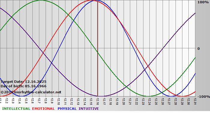 Your biorhythm above the horizontal line indicates that your capacity in that area is enhanced; you feel stronger, more alert, more connected, more empathetic. These are times when you are able to do more, be more, enjoy more. When the biorhythm lines are below 0%, your capacity is diminished, and conservative behavior is recommended.