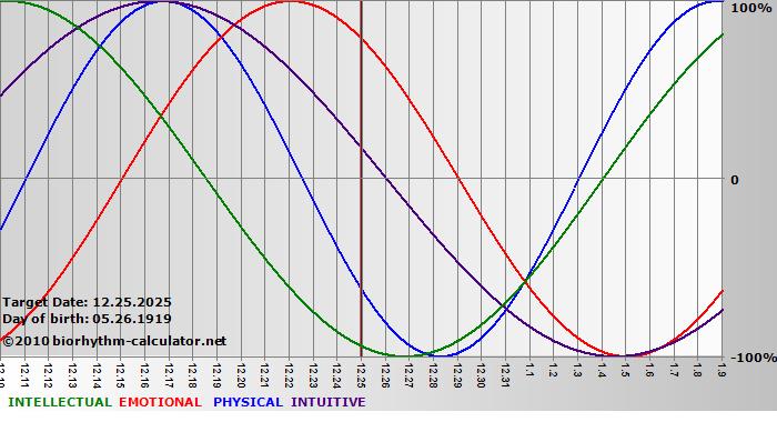 Your biorhythm above the horizontal line indicates that your capacity in that area is enhanced; you feel stronger, more alert, more connected, more empathetic. These are times when you are able to do more, be more, enjoy more. When the biorhythm lines are below 0%, your capacity is diminished, and conservative behavior is recommended.