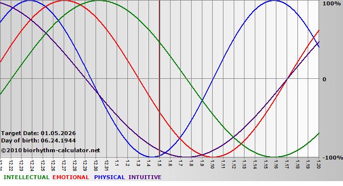 Your biorhythm above the horizontal line indicates that your capacity in that area is enhanced; you feel stronger, more alert, more connected, more empathetic. These are times when you are able to do more, be more, enjoy more. When the biorhythm lines are below 0%, your capacity is diminished, and conservative behavior is recommended.