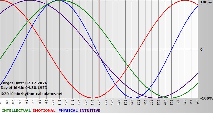 Your biorhythm above the horizontal line indicates that your capacity in that area is enhanced; you feel stronger, more alert, more connected, more empathetic. These are times when you are able to do more, be more, enjoy more. When the biorhythm lines are below 0%, your capacity is diminished, and conservative behavior is recommended.