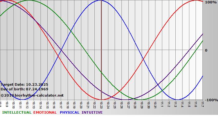 Your biorhythm above the horizontal line indicates that your capacity in that area is enhanced; you feel stronger, more alert, more connected, more empathetic. These are times when you are able to do more, be more, enjoy more. When the biorhythm lines are below 0%, your capacity is diminished, and conservative behavior is recommended.