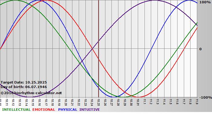 Your biorhythm above the horizontal line indicates that your capacity in that area is enhanced; you feel stronger, more alert, more connected, more empathetic. These are times when you are able to do more, be more, enjoy more. When the biorhythm lines are below 0%, your capacity is diminished, and conservative behavior is recommended.