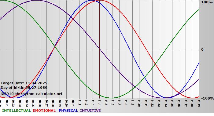 Your biorhythm above the horizontal line indicates that your capacity in that area is enhanced; you feel stronger, more alert, more connected, more empathetic. These are times when you are able to do more, be more, enjoy more. When the biorhythm lines are below 0%, your capacity is diminished, and conservative behavior is recommended.