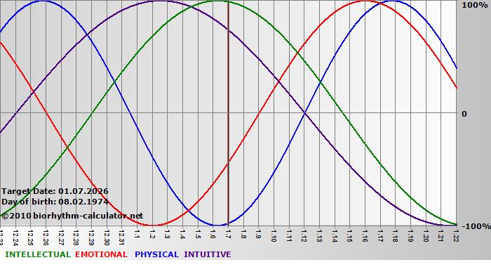 Your biorhythm above the horizontal line indicates that your capacity in that area is enhanced; you feel stronger, more alert, more connected, more empathetic. These are times when you are able to do more, be more, enjoy more. When the biorhythm lines are below 0%, your capacity is diminished, and conservative behavior is recommended.