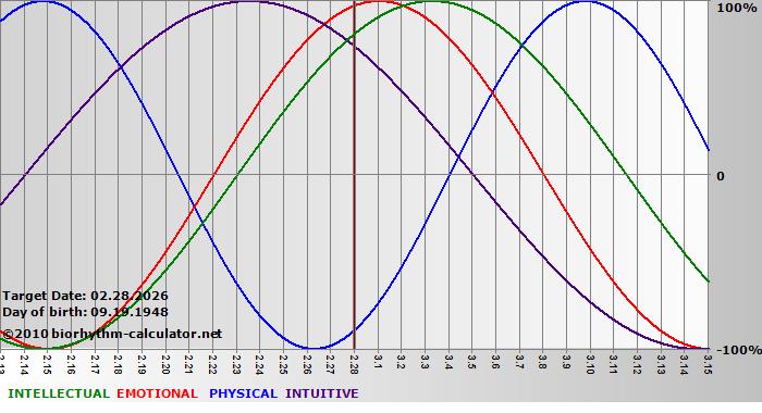 Your biorhythm above the horizontal line indicates that your capacity in that area is enhanced; you feel stronger, more alert, more connected, more empathetic. These are times when you are able to do more, be more, enjoy more. When the biorhythm lines are below 0%, your capacity is diminished, and conservative behavior is recommended.