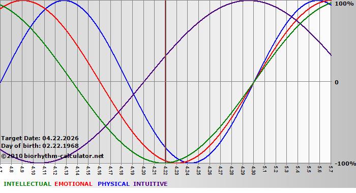 Your biorhythm above the horizontal line indicates that your capacity in that area is enhanced; you feel stronger, more alert, more connected, more empathetic. These are times when you are able to do more, be more, enjoy more. When the biorhythm lines are below 0%, your capacity is diminished, and conservative behavior is recommended.