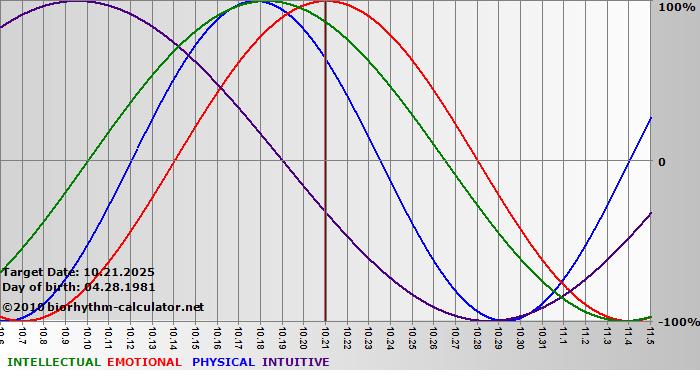 Your biorhythm above the horizontal line indicates that your capacity in that area is enhanced; you feel stronger, more alert, more connected, more empathetic. These are times when you are able to do more, be more, enjoy more. When the biorhythm lines are below 0%, your capacity is diminished, and conservative behavior is recommended.