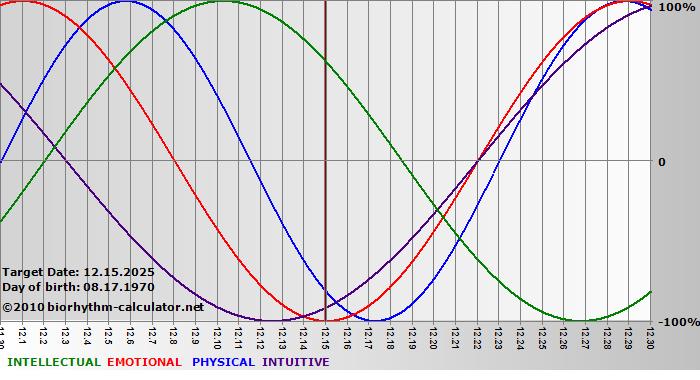 Your biorhythm above the horizontal line indicates that your capacity in that area is enhanced; you feel stronger, more alert, more connected, more empathetic. These are times when you are able to do more, be more, enjoy more. When the biorhythm lines are below 0%, your capacity is diminished, and conservative behavior is recommended.