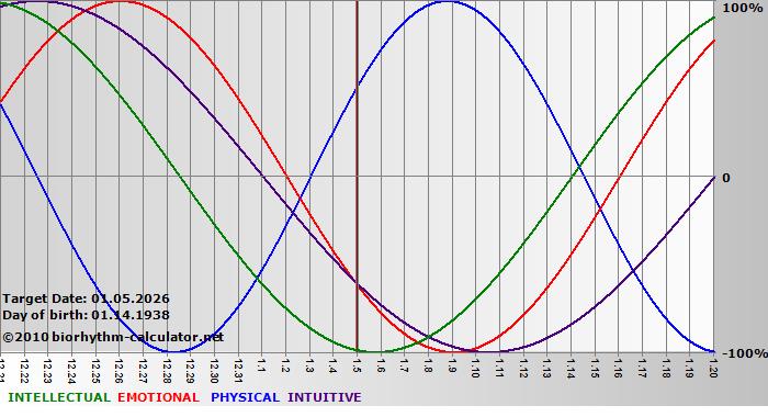 Your biorhythm above the horizontal line indicates that your capacity in that area is enhanced; you feel stronger, more alert, more connected, more empathetic. These are times when you are able to do more, be more, enjoy more. When the biorhythm lines are below 0%, your capacity is diminished, and conservative behavior is recommended.