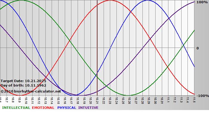 Your biorhythm above the horizontal line indicates that your capacity in that area is enhanced; you feel stronger, more alert, more connected, more empathetic. These are times when you are able to do more, be more, enjoy more. When the biorhythm lines are below 0%, your capacity is diminished, and conservative behavior is recommended.