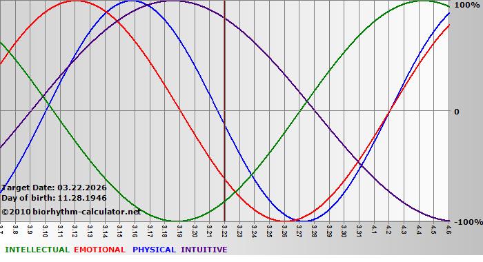 Your biorhythm above the horizontal line indicates that your capacity in that area is enhanced; you feel stronger, more alert, more connected, more empathetic. These are times when you are able to do more, be more, enjoy more. When the biorhythm lines are below 0%, your capacity is diminished, and conservative behavior is recommended.