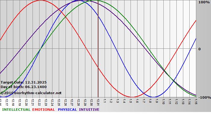 Your biorhythm above the horizontal line indicates that your capacity in that area is enhanced; you feel stronger, more alert, more connected, more empathetic. These are times when you are able to do more, be more, enjoy more. When the biorhythm lines are below 0%, your capacity is diminished, and conservative behavior is recommended.