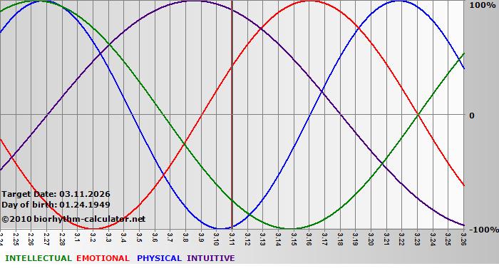 Your biorhythm above the horizontal line indicates that your capacity in that area is enhanced; you feel stronger, more alert, more connected, more empathetic. These are times when you are able to do more, be more, enjoy more. When the biorhythm lines are below 0%, your capacity is diminished, and conservative behavior is recommended.