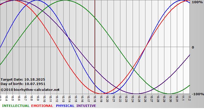 Your biorhythm above the horizontal line indicates that your capacity in that area is enhanced; you feel stronger, more alert, more connected, more empathetic. These are times when you are able to do more, be more, enjoy more. When the biorhythm lines are below 0%, your capacity is diminished, and conservative behavior is recommended.