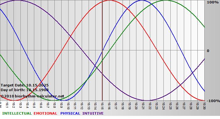 Your biorhythm above the horizontal line indicates that your capacity in that area is enhanced; you feel stronger, more alert, more connected, more empathetic. These are times when you are able to do more, be more, enjoy more. When the biorhythm lines are below 0%, your capacity is diminished, and conservative behavior is recommended.