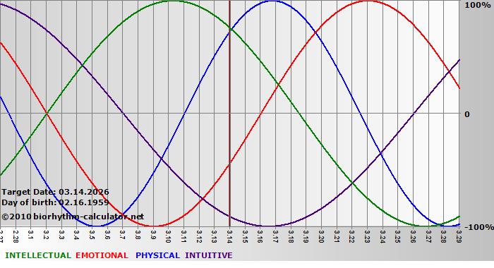 Your biorhythm above the horizontal line indicates that your capacity in that area is enhanced; you feel stronger, more alert, more connected, more empathetic. These are times when you are able to do more, be more, enjoy more. When the biorhythm lines are below 0%, your capacity is diminished, and conservative behavior is recommended.