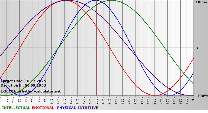 Your biorhythm above the horizontal line indicates that your capacity in that area is enhanced; you feel stronger, more alert, more connected, more empathetic. These are times when you are able to do more, be more, enjoy more. When the biorhythm lines are below 0%, your capacity is diminished, and conservative behavior is recommended.